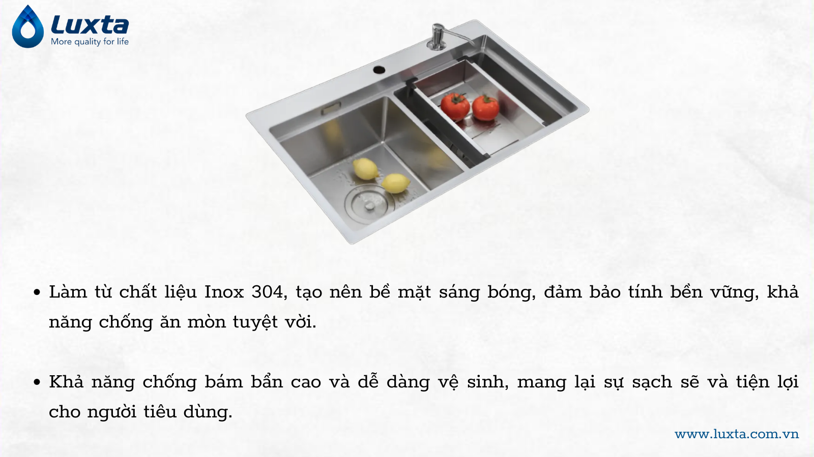 Khả năng chống bám bẩn cao và dễ dàng vệ sinh.Hãy tân trang không gian bếp của bạn với chậu chén Luxta inox LC8049S -3.0 và trải nghiệm sự tiện nghi trong mỗi công việc nấu nướng.