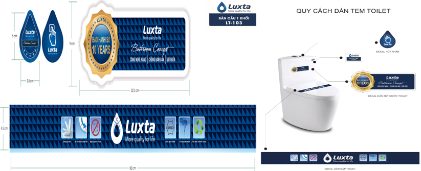 Những sản phẩm bồn cầu 1 khối Luxta khi đến tay khách hàng luôn phải đảm bảo uy tín và chất lượng bao gồm : tem nút nhấn, tem dán lưng bồn cầu, tem dán nắp bồn cầu, tem model sản phẩm.