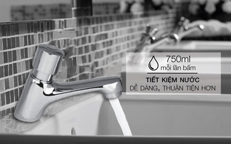 Với công nghệ chỉ cho phép một lượng nước cố định (750 ml) chảy mỗi lần bấm.Vòi bấm khiến việc tiết kiệm nước trở nên dễ dàng, thuận tiện hơn.